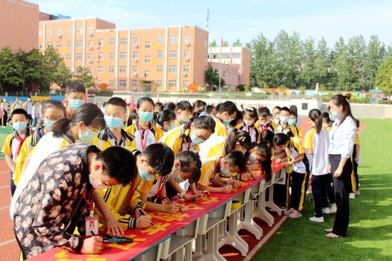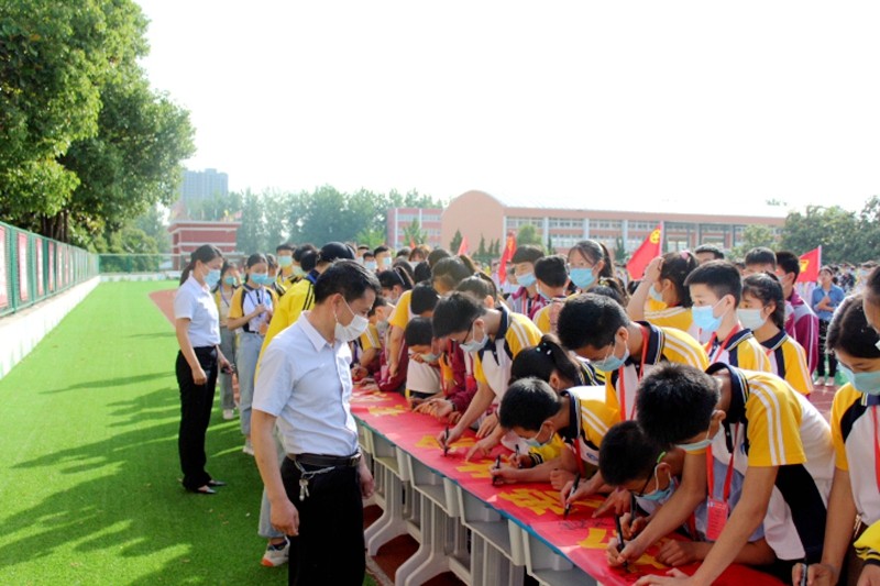 各学部学生代表在防溺水横幅上签下自己的班级、姓名