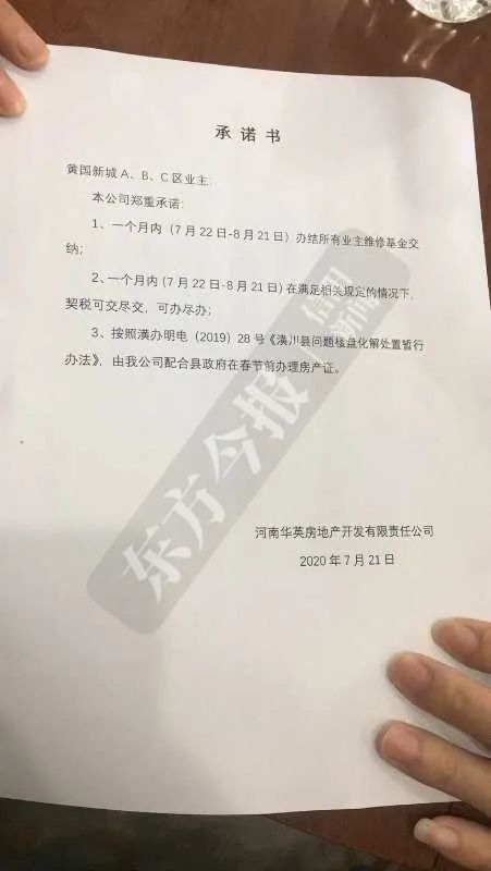 汪女士告诉记者,近期全款购房业主都在要求开发商给一个解决办法,迫于压力,华英地产出具了一份承诺书,落款日期为7月21日。