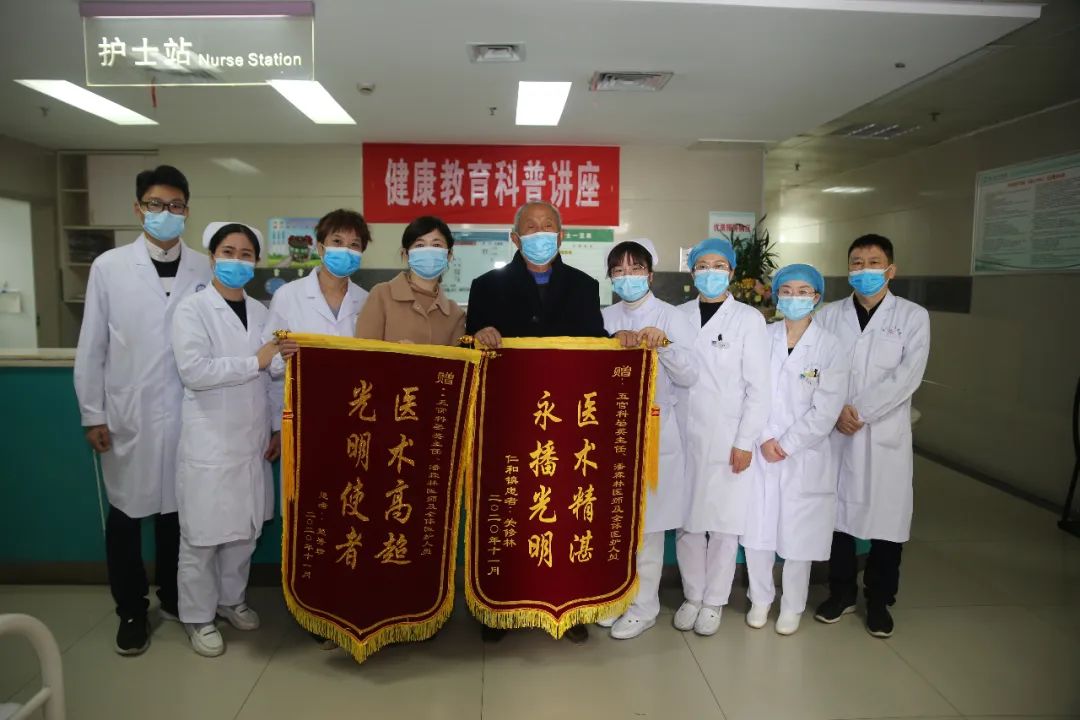 据了解,两面锦旗分别是两位白内障病人送的,一位是八十多岁的仁和退休老师,术后视力恢复良好,老人出院后又专程赶来送锦旗;另一位送锦旗的是一位老太太患者的家属,因为行动不便委托家属前来送旗。两位患者均是因白内障住院治疗,在接受了白内障超声乳化手术后,恢复良好,重见光明。