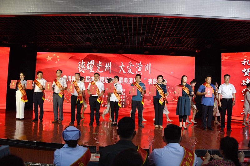 颁奖晚会上,县领导为10名潢川县第三届县道德模范、10名道德模范提名、20名最美潢川人颁奖。