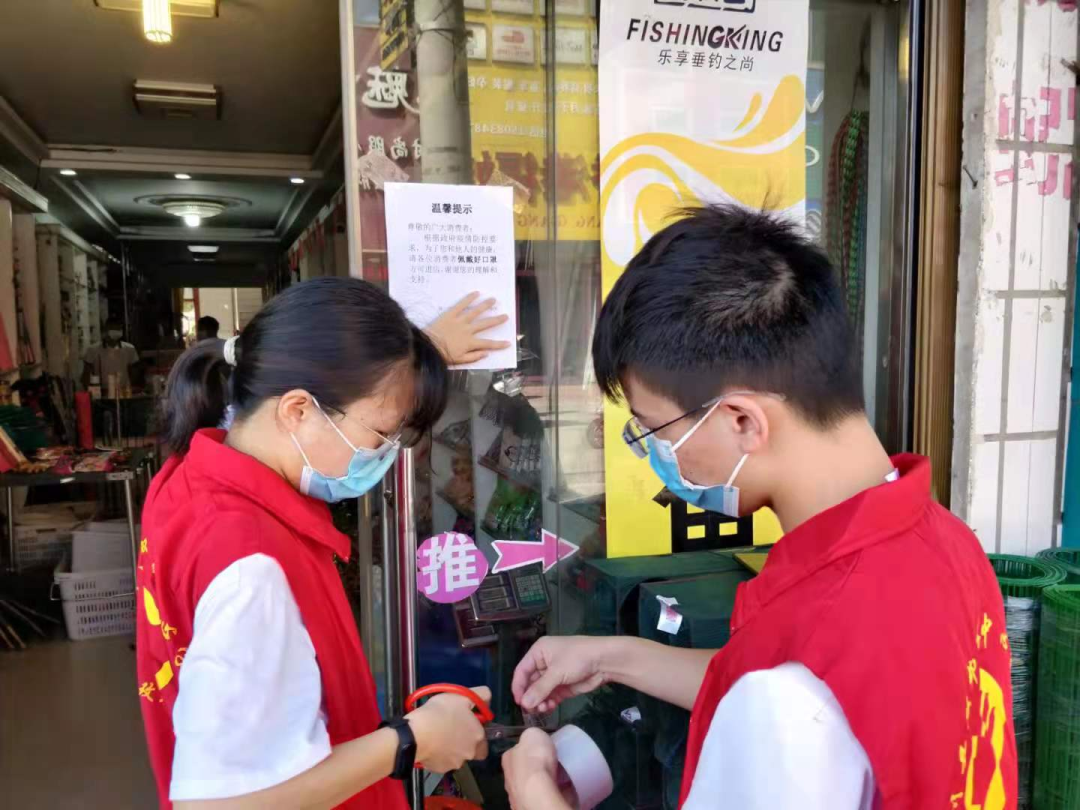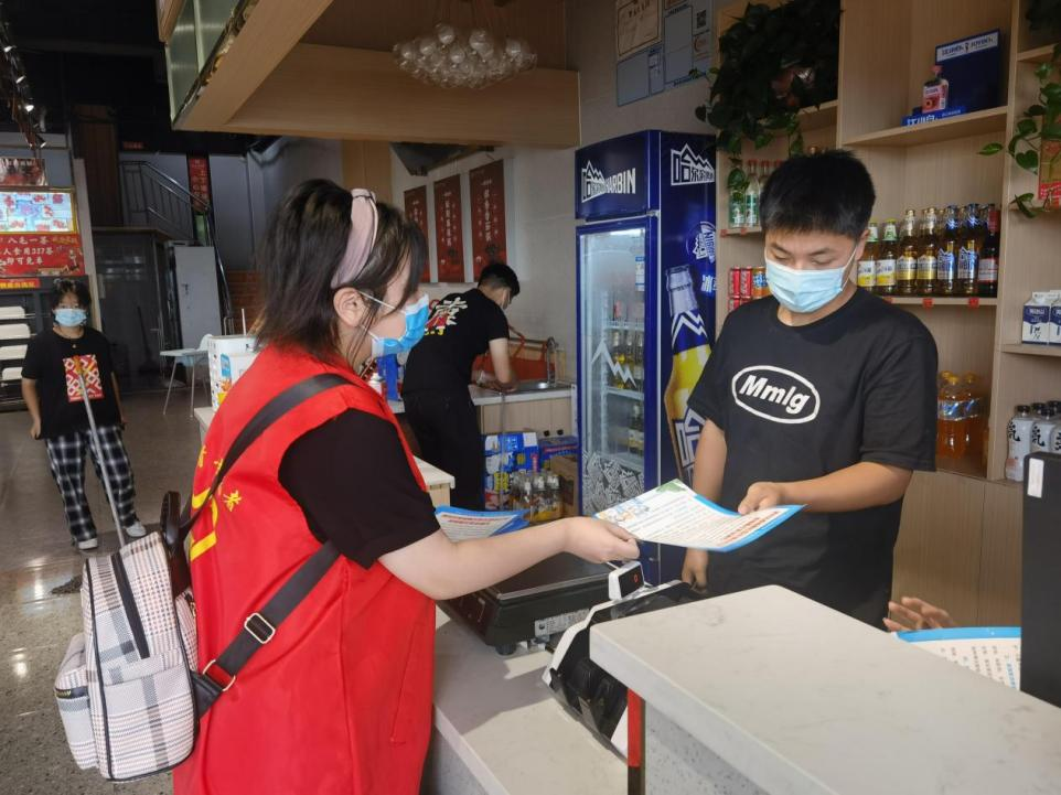 返乡大学生志愿者在清水湾天福顺超市路口、沿街商铺门店等处开展防疫知识教育宣传行动。