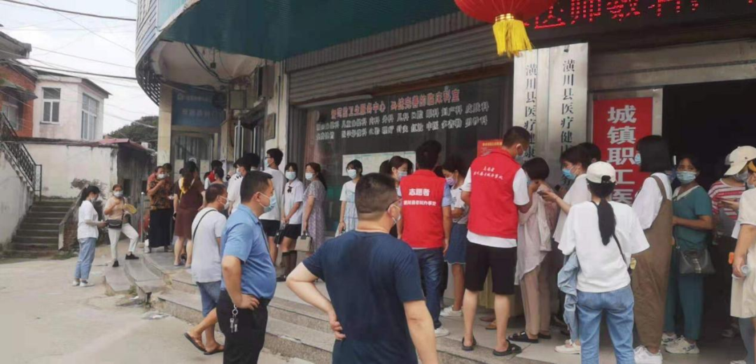 返乡大学生志愿在潢川二院配合医护人员,开展青年学生接种疫苗的引导、登记、秩序维护相关工作。