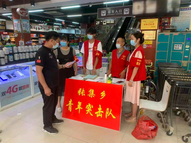 张集乡返家乡大学生志愿者助力青年突击队在各大超市值守,保证进入超市人员持有绿码,佩戴口罩,体温正常。
