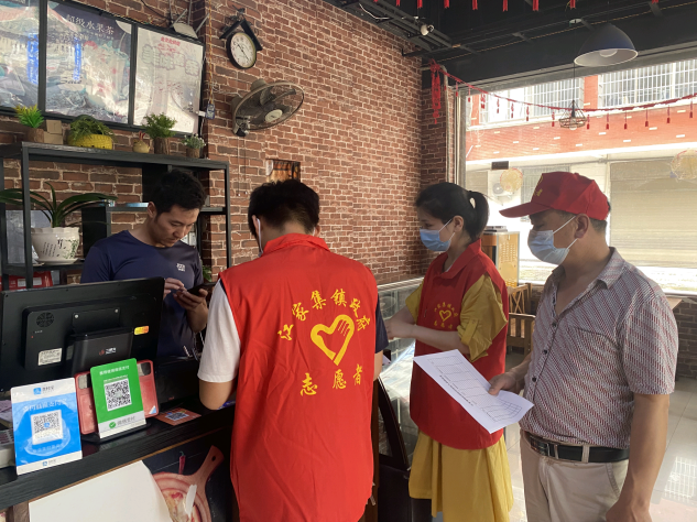 返家乡大学生志愿者在江家集镇开展疫情防控宣传和健康码扫码排查登记工作。