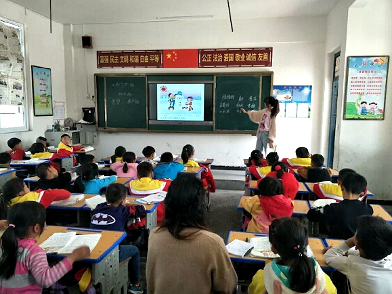 课上,语文教师通过多媒体播放图片,代入词语,让学生能更快的了解讲解词语的意思,各班语文教师在讲解的同时还为学生们演唱歌曲来舒缓学习中的疲惫,同时也让听课教师陶醉其中。数学教师通过多媒体播放几何图形,并给每个学生发放了几何图形实物,让学生通过眼来观看、手来触摸、耳来听讲解,更快速的了解所讲内容。