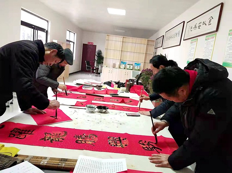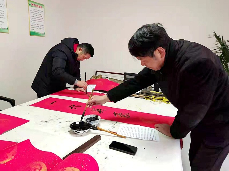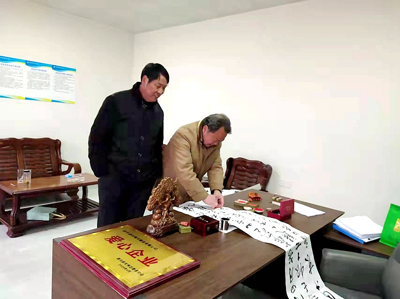 由于刚刚建好,还没来得及安装空调,豫川粮业的会议室里寒气彻骨,冷风一阵阵从门缝里挤进来扑在脸上、手上,但根本不影响书法家们的勤奋创作,他们精心地写出一幅幅风格不同、字体迥异的书法作品和春联,受到豫川粮业总经理和员工们高度称赞和一致好评,他们捧着潢川作协赠送的20本书和这些彰显企业文化的作品,左看右看,真是爱不释手。