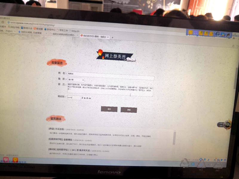 活动中,全校师生及家长利用微机课或手机微信积极登录潢川文明网、信阳文明网向英雄们献花、留言纪念。通过互联网纪念革命先烈的方式,来凭吊革命先烈,表达了他们对先烈们的崇敬。