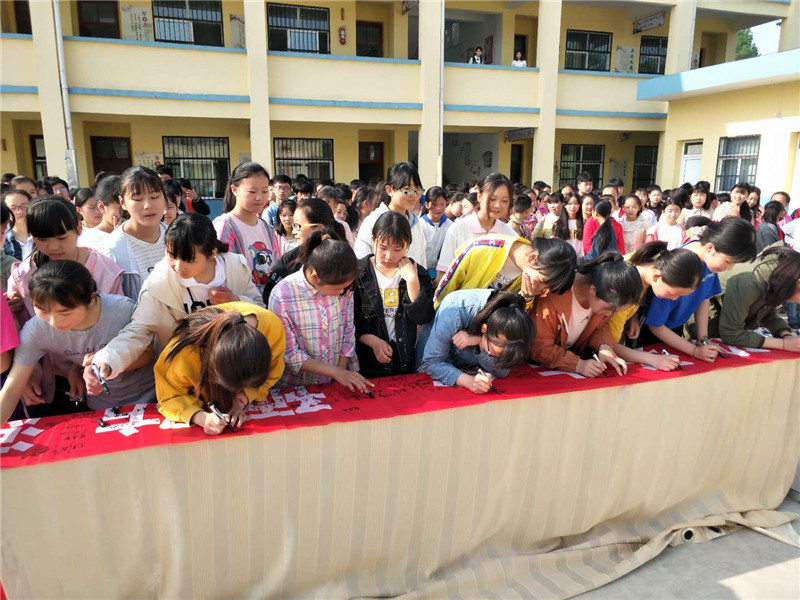 学生积极在横幅上签名承诺