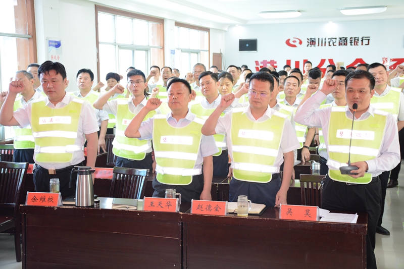 会上,潢川农商银行董事长王天华向五大战队授予了清收战旗。行长赵德全领学了《潢川农商银行欠息90天贷款利息集中清收风暴活动实施方案》,并带领全体参会人员进行了清收宣誓。