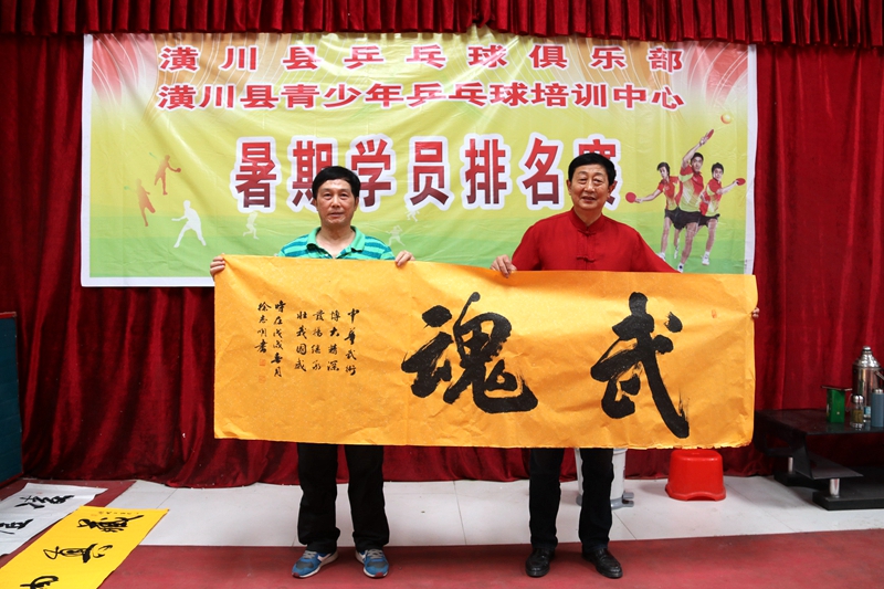 徐志明先生刚刚在光山县参加完 "豫南书画名家邀请展"活动,即来到潢川,在县体育中心乒乓球俱乐部,徐志明先生和在场的同志亲切交流。他说,回到了久别的故乡,看到家乡发展迅速,取得了如此突出的成就,感慨万千、百感交集,同时希望能为家乡贡献自己的一份微薄之力;并和老年书协的同志们畅谈自己对书法艺术的感受和体会,兴致起处,即兴泼墨,为家乡留下多幅酣畅淋漓的书法作品。徐志明先生以其娴熟的技巧和深厚的功力令在场的书法爱好者们深深折服,连呼了得。