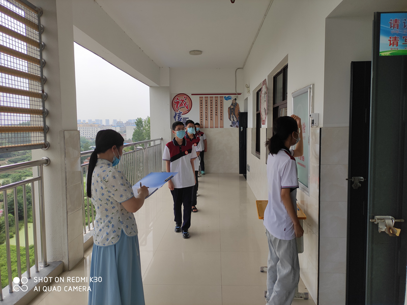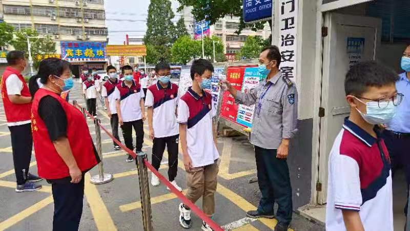 演练分别就学校教职工入校保持安全距离、佩戴口罩,扫码后有序通过测温仪进入校园;校门口由值班教师、保安等组织学生有序排队等候,间隔一米入校,测量体温,提醒学生合理佩戴口罩,而后有序进入校园;发现学生体温异常,将学生带至隔离室、询问14天内旅居史,若有中高风险旅居史,立即启动《潢川四中疫情防控应急预案》立即上报,做好登记并进行相应的心理疏导,由值班教师通过电话联系南城医院,并及时告知班主任及家长。后勤消毒负责校园大门口以及体温监测点和应急隔离点的随机消毒;各班主任组织人员对本班学生进行入班测温,填好日常体温表方能入班。上课中九(1)班班主任发现一名学生有发热症状,随后上报值班领导,并电话通知家长,学校迅速启动应急预案,现场处置组将学生带至隔离室救治。
