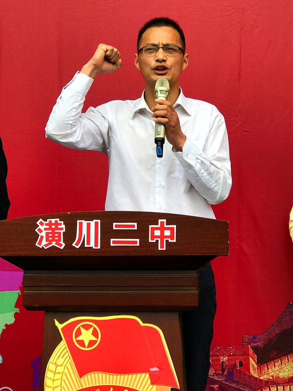 在二中团委书记谈俊强的领誓下,新团员进行入团宣誓