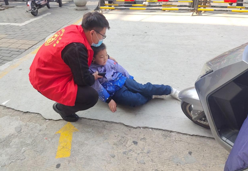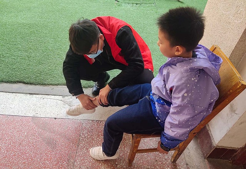 演练模拟放学时学生有序离校,有一骑电动车男子将学生撞倒,在迎宾路上值班教师报告当天带班领导并拨打120急救电话,相关人员立刻赶往事故现场,检查学生受伤情况并为其简单处理伤口,后由救护车把受伤人员送往医院。