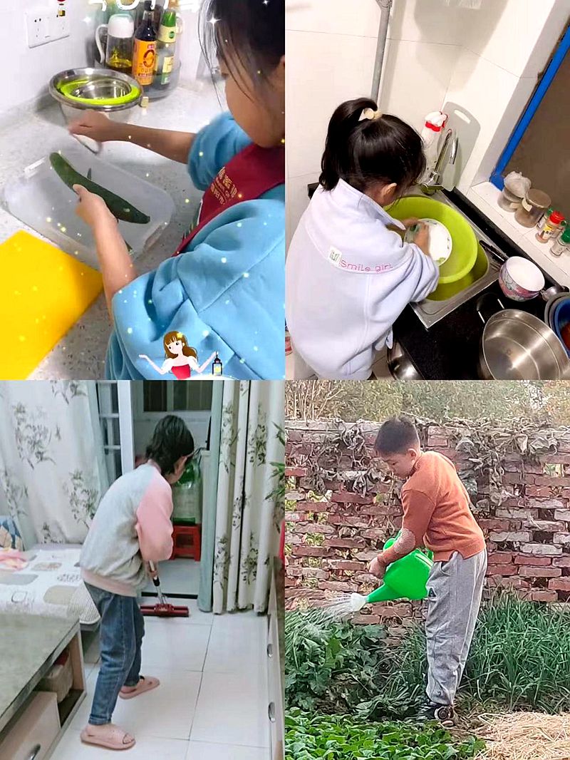 课余时间,同学们用自己的实际行动回馈父母,帮父母分担家务。他们为家人做美味可口的饭菜,整理自己的书桌、房间,整理洗漱用品,照顾家里的动植物。孩子们在劳动中有所收获,从而体会父母的不易;在劳动中同学们锻炼了意志,更黏合了亲情。
