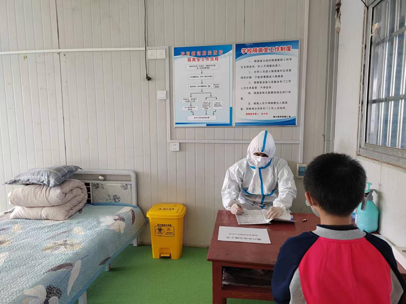 四模拟突发情况的应急处置。上课途中,一学生连续咳嗽,任课教师停止上课,并询问学生有哪些不舒服的地方。学生体温异常,教师停止上课,引导该生到教室门外,任课老师向学校疫情防控负责人报告,负责人把学生带到隔离室,一路上避开其他人员,然后用水银体温计测量体温,并询问其身体情况及近14天的旅居室和接触人员等,做好记录。若无流行病学史,引导发热学生到校内留观室隔离。班主任电话与家长联系,通知家长来校带其前往附近发热门诊就诊,尽量避免乘坐公共交通工具。若学生有流行病学史,负责人立即向校长汇报,通知家长并联系120安排转送至附近发热门诊就诊排查。之后,校长启动学校应急预案并报属地教育行政部门。其他学生留守在教室内不得随意走动,做好课堂纪律的维护,停止一切班级交叉活动。同时,做好发热学生班级区域和隔离室区域警戒线的划定,避免其他人员误入,做好物资保障,及时做好教室隔离室和该学生活动区域的终末消毒。