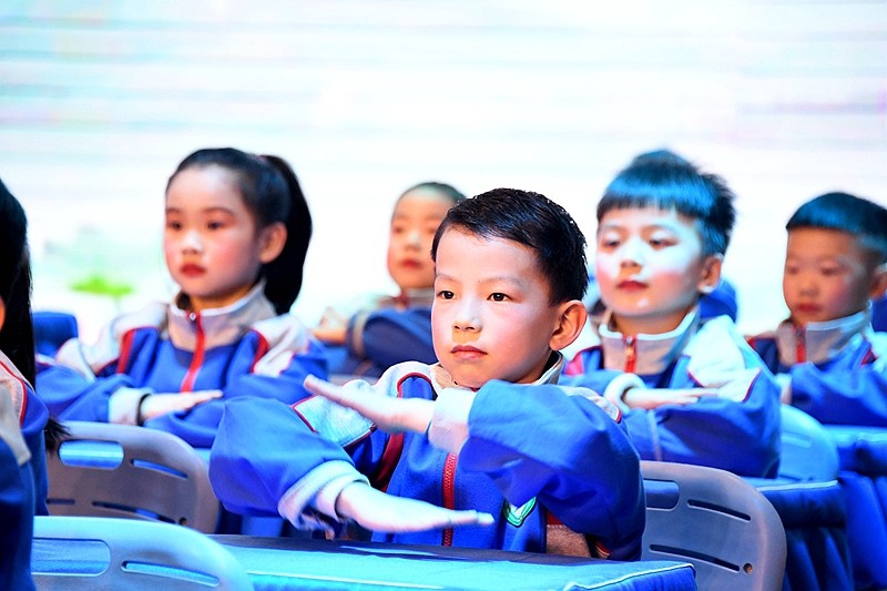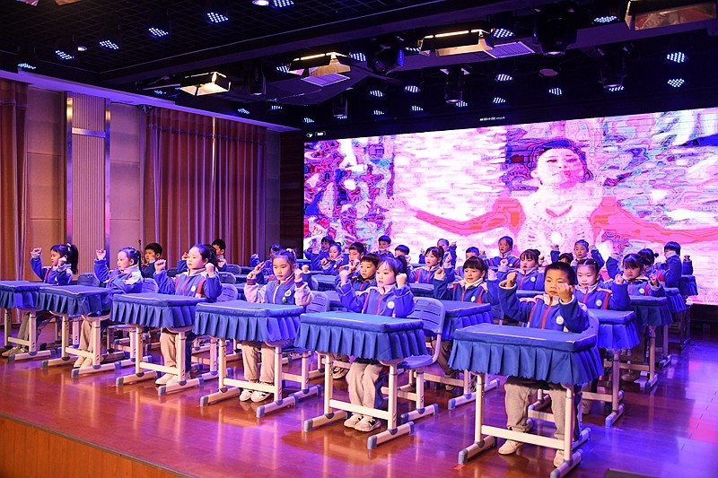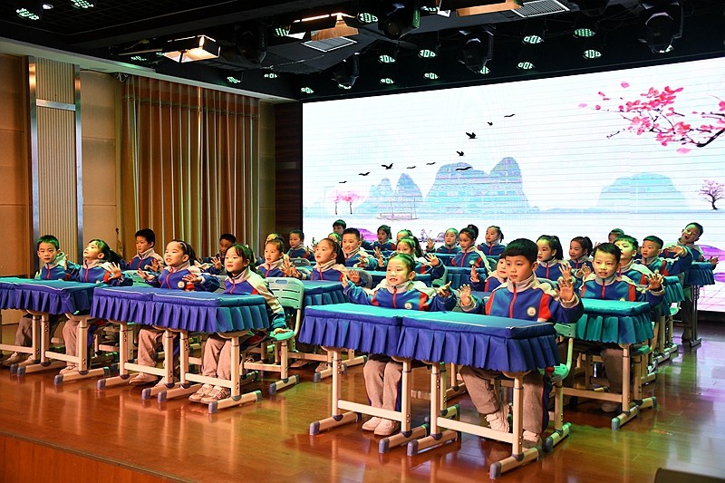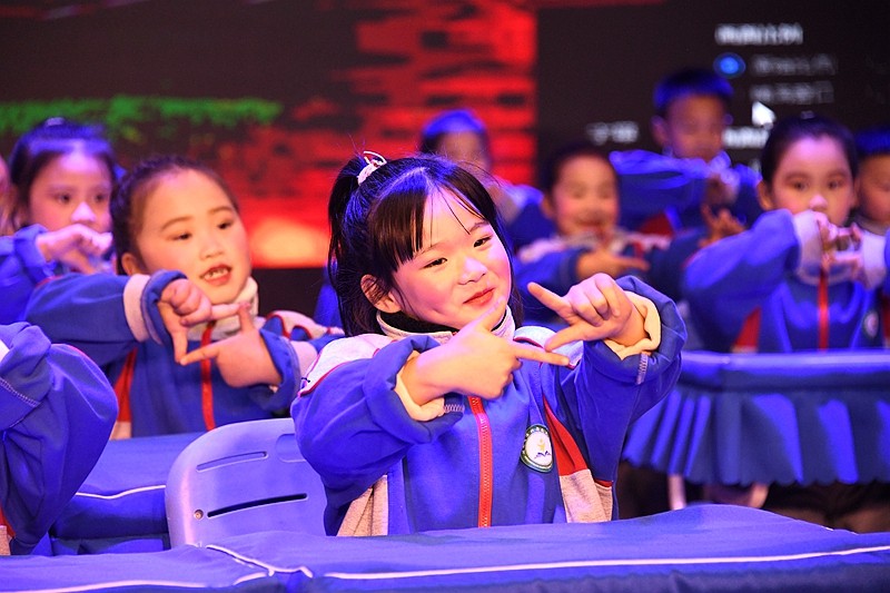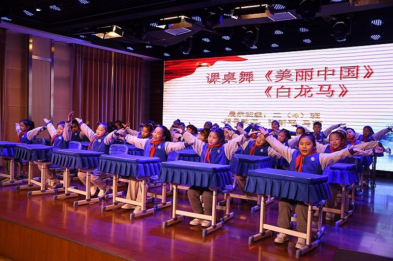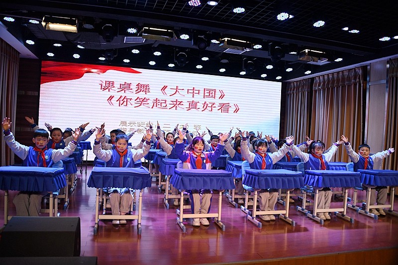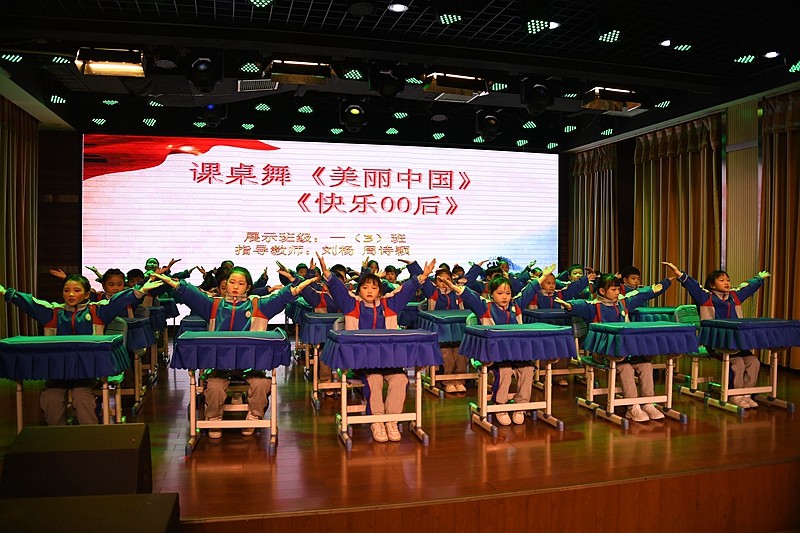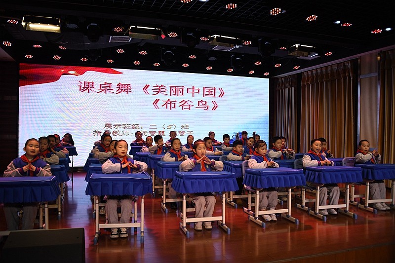 活动伊始,校长周卫发表热情洋溢的致辞,她说,自“双减”政策实施以来,学校根据小学生的特点,创新教育教学形式,充分发挥课堂阵地作用,将课桌作为一种敲击乐器,融入舞蹈动作,结合歌曲教唱进行教学。“课桌舞”不受场地限制,学生坐在课桌前随着音乐就能全身动起来,以缓解学生们的疲劳,打开健康快乐的学习模式,使学生身心得到全面放松,消除学生在课堂静坐、伏案读书、写字时产生的疲劳感,既能锻炼身体,又能提高学习效率,深受学生喜爱,得到家长和社会的一致好评。