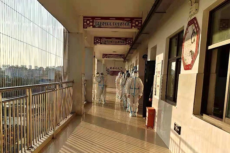 演练模拟,学校接到上级电话通知,在师生全员核酸检测中发现本校八年级二班有一管核酸检测结果阳性,秦连江立即宣布启动应急预案。紧接着,后勤保障组第一时间向教职工配发防疫物质;人员转移组立即做好防护来到检测出阳性病例的班级、并给流调组报告名单上的20名学生分发防护服、随即分男女两组分别带到隔离室;在隔离室核酸检测组立即给20名学生进行核酸检测,最终锁定一名初筛核酸阳性学生,立即进行隔离;隔离期间心理健康教育组做好防护的同时立即安抚学生情绪,等待医院转运车直接转进定点医疗机构进行救治。初筛核酸阳性学生班级的密接者带至备用教室间隔两米做好防护就做;消毒人员穿好防护服对班级、厕所、走廊隔离室等进行全面消杀。