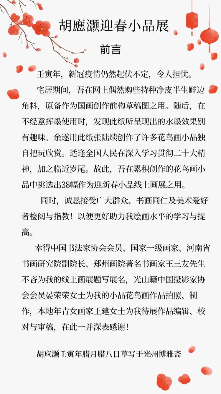 胡应灏,男,字,定国;号,子谷门生。一九六四年八月生,河南省潢川县人。任职单位:潢川县农商银行。中共党员,西南财经大学夲科学历,经济师职称。中国书画名家协会理事、河南省美术家协会会员、河南省文化艺术收藏工作委员会会员、中华诗词学会会员、河南省作家协会会员、信阳市武协会员、潢川县武术家协会副主席、潢川县老年书画研究会副会长、潢川县美术家协会副主席、副秘书长。自幼爱好书画,拜访多家名师指导受益匪浅。几十年来笔耕不辍,潜心中国书法与水墨画研究与发展,作品经常参加全国及省、市、县举办的书画展入展并获奖无数。2016年还荣获河南省农村信用社系统书画大赛中国画一等奖。作品广被国内多家机构、企业、文博馆和个人收藏,均获一致好评。