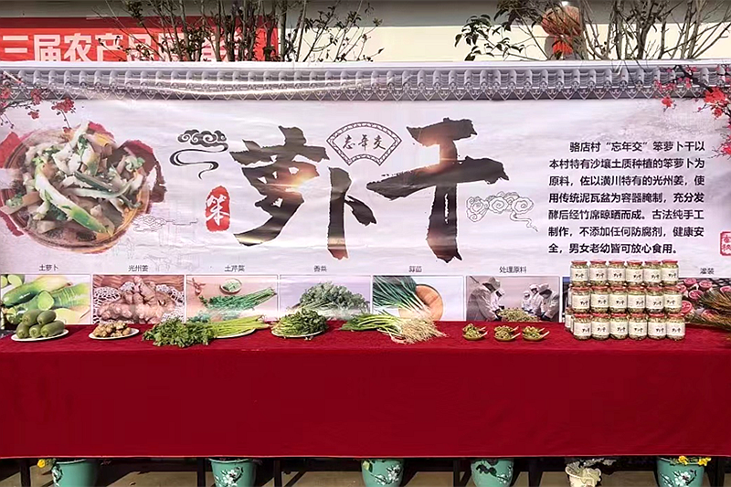 骆店村“忘年交”萝卜干以本村特有沙壤土质种植的土萝卜为原料,佐以潢川特有的光州姜,使用传统泥瓦盆为容器腌制,充分发酵后经竹席晾晒,纯手工制作,口感爽脆,具有浓郁的地方特色。