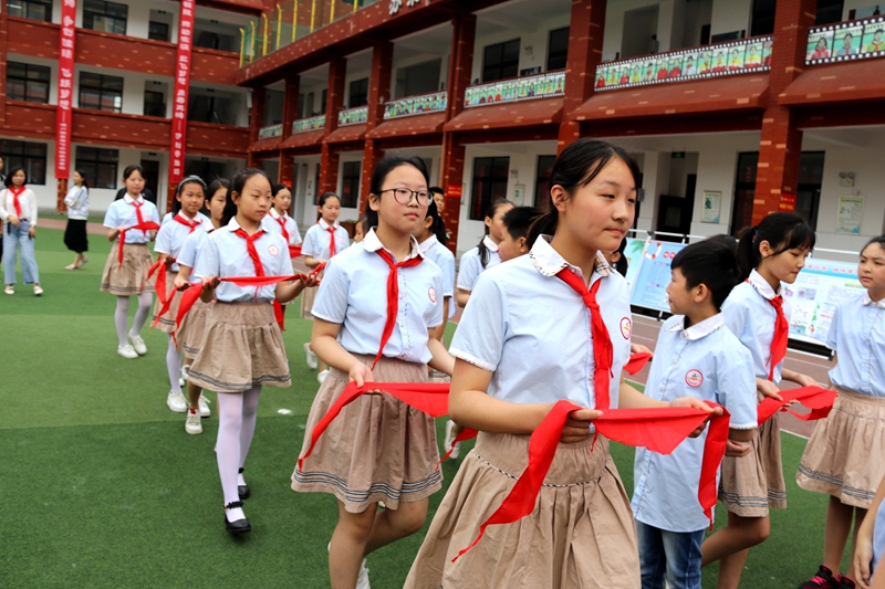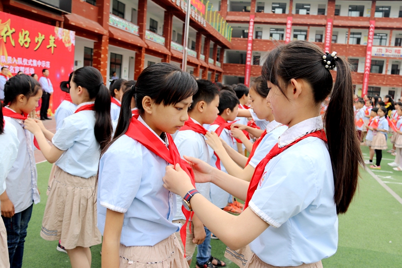 活动开始前,实验小学校长张树平代表学校向新队员们提出殷切希望,并要求全体学生们提高安全防范意识,远离溺水事故的发生。伴随着雄壮高昂的旋律响起,同学们高唱《中国少年先锋队队歌》,嘹亮的歌声拉开了入队仪式的帷幕,出旗、敬礼、献红领巾……少先队员们用行动表达着自己内心的喜悦。中队辅导员朝红艳老师宣布了新队员入队名单。老队员们为54名新队员代表系上了鲜艳的红领巾,新队员在大队长的带领下面对队旗表决心、立誓言,这群新队员右手握拳举过头顶进行宣誓,虽然孩子们表情不一,个头不一,性别不同,心智不一,但队员们脸上写满了激动、骄傲、自豪和光荣。更表达了同学们对少先队组织的热爱之情!