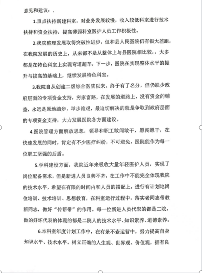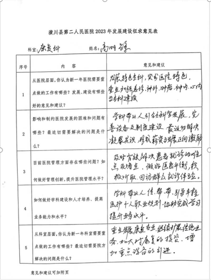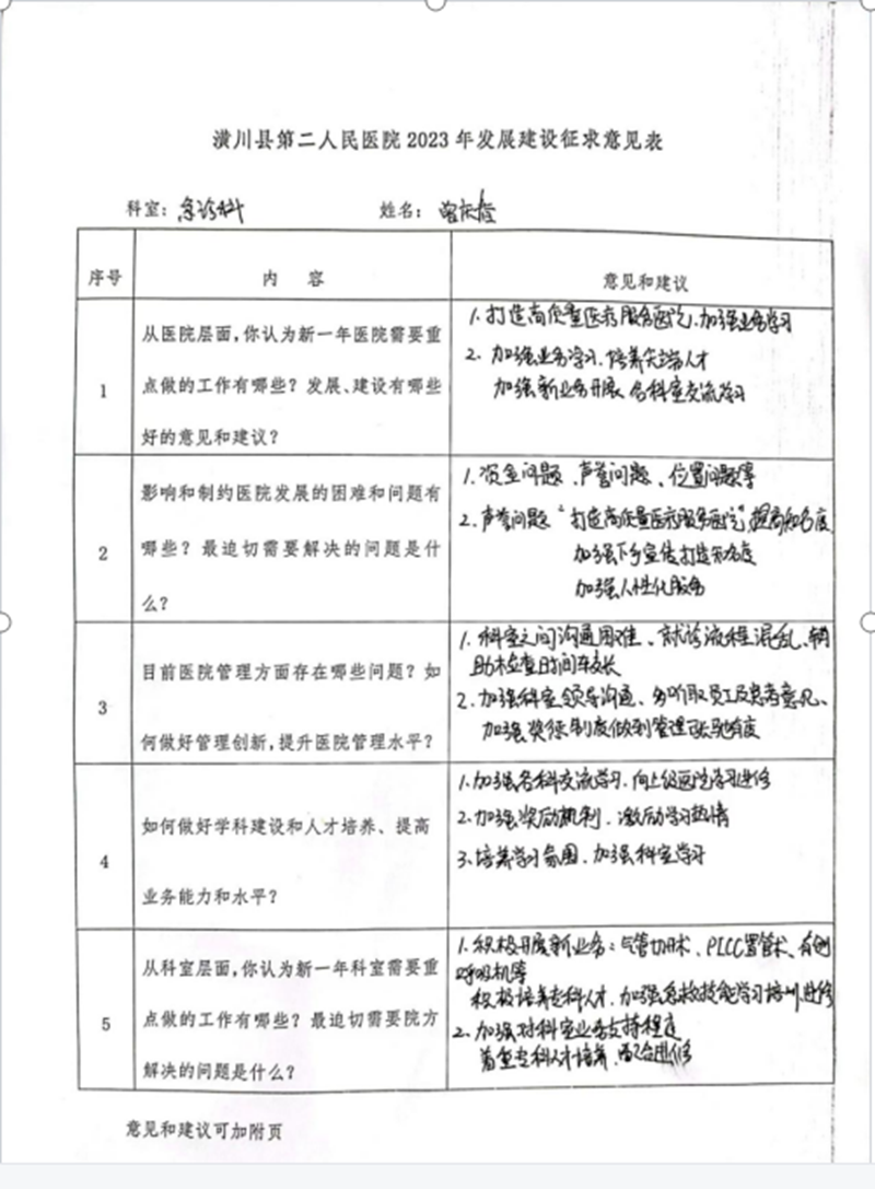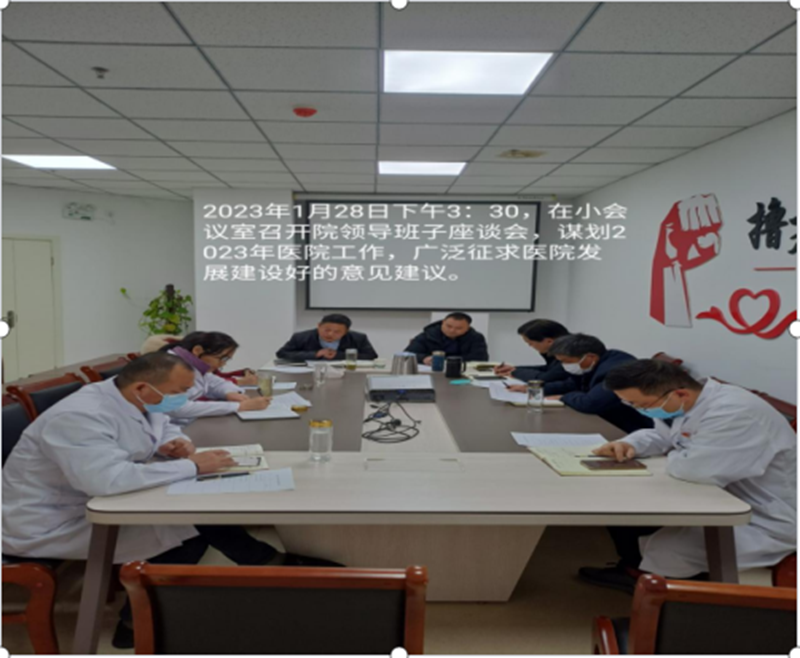正月初七至十四,不分昼夜连续召开院领导班子、护理、医技医辅、中医康复理疗、临床、三大中心创建、行政职能科室等7场座谈会和质控管理、清廉医院创建推进会,并面向全院370多名职工下发了《2023年医院发展征求意见表》,广泛倾听、征求院班子成员、中层干部、一线人员、党员、人大代表、政协委员、老同志等的意见建议,对近两年的工作进行认真总结,分析医院存在的主要风险和问题,反思管理上的漏洞和短板,谋划2023年乃至今后一段时期医院的主要任务、发展目标与路径。