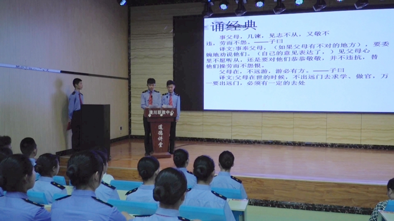 本次活动分为七个环节。在歌曲《相亲相爱的一家人》的深情演唱中,道德讲堂活动拉开了序幕。在两位同学的带领下,大家诵读了有关孝老爱亲的经典名句,在中华民族博大精深的文化中寻找心灵的滋养。学模范环节,三位孝老爱亲模范的感人事迹深深打动了大家。三位同学讲述了自己的故事,他们用自己的亲身经历感染和教育的在场的每一个人,有的同学不禁回想起自己和爷爷奶奶爸爸妈妈之间的点点滴滴,流下了深情的泪水。举起右手,同学们庄严承诺:“父母呼,应勿缓;父母命,行勿懒;父母教,须敬听;父母责,须顺承”。最后班主任罗敏老师给大家上了一堂生动的团课,鼓励同学们:孝顺父母亲人要越早越好,不要等到来不及了,也不要等到没有机会了。至亲之情不应该是看着彼此的背影渐行渐远,而应该是你养我长大,我陪你变老。