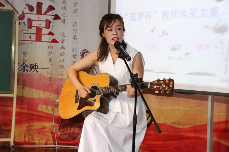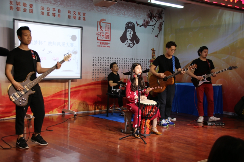 才艺展示环节更是精彩纷呈,各具特色。1号95后选手周国桔和她的乐队共同演绎的云南手鼓、吉他、架子鼓合奏《小宝贝》,一开篇就引爆全场;2号李静老师带来的印度舞蹈富含浓郁异族风情,妖娆动人,舞姿翩跹,意境悠远;4号崔银丽老师吉他深情弹唱,歌喉清丽,悠扬婉转;5号冯晓婷老师的书画展示《荷趣》,清丽脱俗,惟妙惟肖;6号张正丽老师爵士舞表演《ABV by》热情奔放、动感十足; 7号龚丽老师的师生歌舞组合激情飞扬,为大赛完美作结。还有那轻柔曼妙的手工展示、沉稳大气的板书设计都为大赛增辉添彩;每个环节的的展示,选手们都匠心独运、别出心裁,给在场领导和老师以美的视听享受。在这展示才华,PK艺术的交流平台上,该校的教师们谱写激情飞扬的动人旋律,吟诵师者的的熠熠华彩。比赛现场高潮迭起,掌声不断。