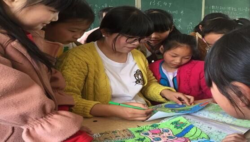 人生转折的9月,她如愿成为一名农村一线的小学特岗教师,来不及喘口气,顾不上熟悉环境,听不懂地方方言,她没有退缩没有抱怨,瘦弱的肩膀勇敢挑起重任。面临学校教师短缺的现状,除了担任高年级主科课程,她发挥特长优势自愿担任全校一到六年级美术课程。本着扎实的专业基础和实事求是的态度,班级在她的带领下,蒸蒸日上,从“三差”班级到“优秀班集体”,每周的“我和老师齐画画”专栏展板上,折射出她和孩子共同描绘自己蓝图的场景。从语言不通到饮食不服,从举目无亲到孤独无依,一个刚从大学校园出来的姑娘只身来到这里从事教育工作,需要太大的勇气,需克服太多的困难。吃住在校的她,最怕的可能是电的问题:由于学校电路老化电压很不稳定,每次把米放进锅里等到一大摞作业改完,掀开锅却发现米还是米水还是水……冬天里刺骨的洗脸水对她来说就是家常便饭。但她总是 乐观坦然的面对这一切,即便是晴天一身灰,雨天一身泥,车带一周扎破两三次的道路也阻止不了她播撒爱的脚步。