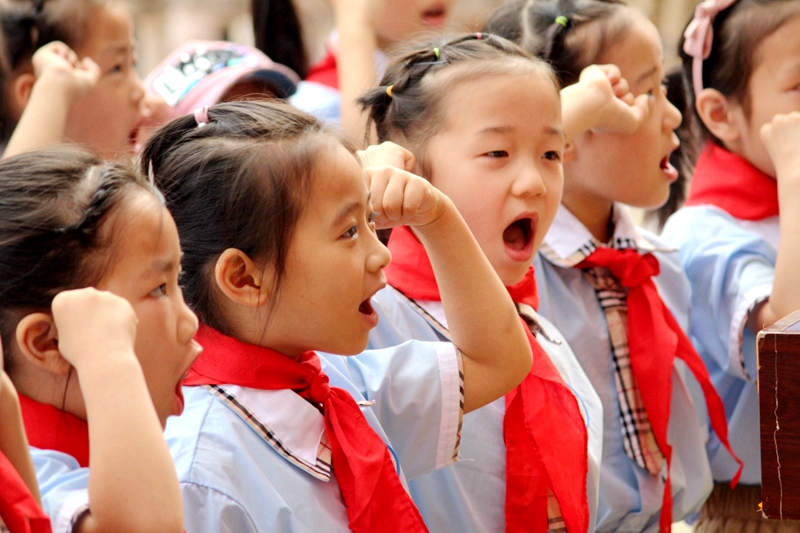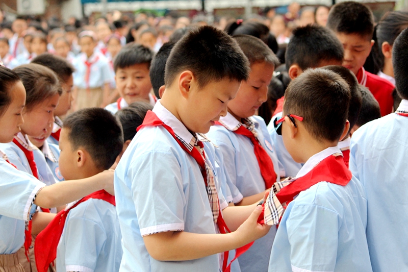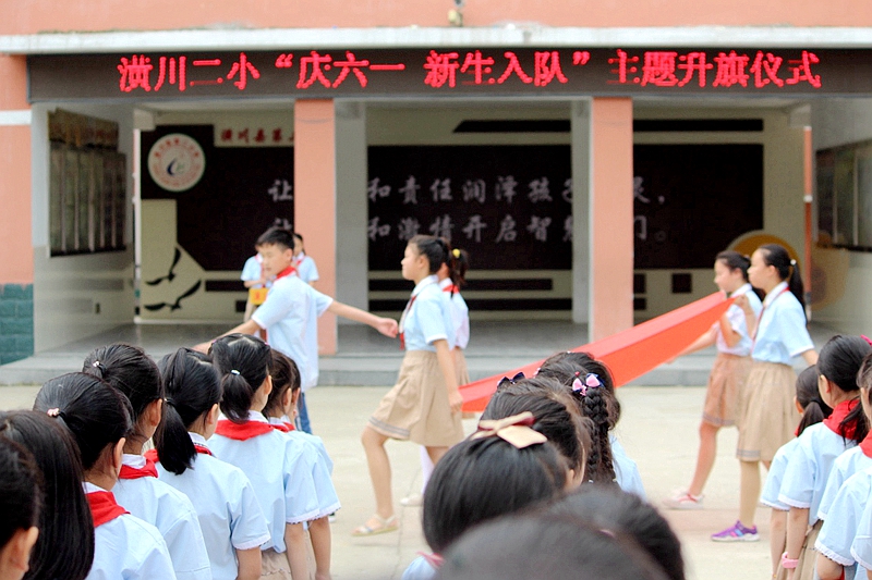 入队仪式在少先队辅导员王娟主持,一年级的学生在操场上排着整齐列队,穿着漂亮的衣服,怀着喜悦心情,个个脸上洋溢着期待和美好追求。在激昂的出旗曲中,少先队员马亚东擎着队旗,精神抖擞地迈着矫健整齐的步伐,庄严的出旗。入队仪式由此拉开序幕。当雄壮振奋人心的《中国少年先锋队队歌》响起时,同学们齐声高唱队歌,他们用嘹亮的歌声,表达对队组织的热爱和内心无比的喜悦。接着,少先队辅导员王娟宣布新队员的名单,随后,由五年级的队员代表庄重地为新队员系上鲜艳的红领巾。当红领巾在新队员胸前飘起时,新队员的脸上都洋溢着激动与自豪。在大队辅导员王娟老师的带领下,新队员举起右拳,在队旗下庄严地宣誓:“为共产主义事业而奋斗!时刻准备着!……”这嘹亮的呼声,在操场上空久久飘荡。新队员洪汇琳代表新队员表示他们决心听从党的教导,努力成为社会主义建设需要的合格人才,做共产主义事业的接班人。最后,大队辅导员王娟向向新队员们光荣入队表示热烈欢迎和衷心的祝贺,同时也向新队员们提出了殷切的希望,希望新队员们要有崇高的理想,要胸怀大志、努力学习,使自己成为一个有理想、有道德、有纪律、有文化的共产主义事业接班人。入队仪式在嘹亮的退旗曲中,落下帷幕。