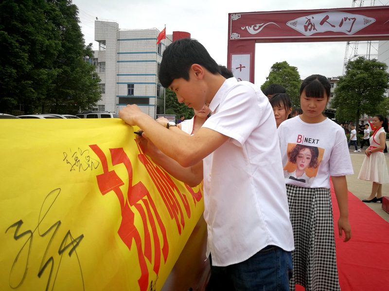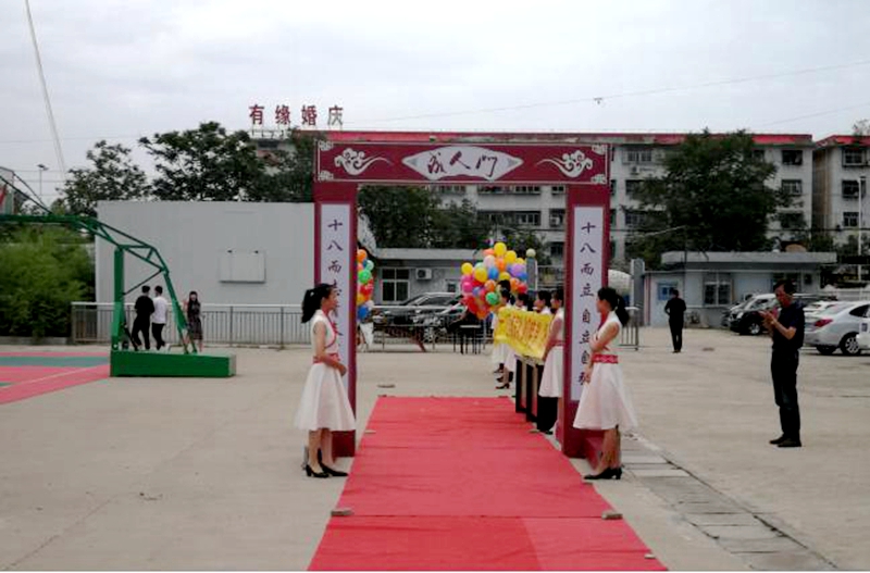 仪式开始前,在温馨的音乐声中,146名满18岁的学生伴随着《十八已至》的朗诵,与家长和老师携手,走上了青春的红毯,迈入了象征着青春与梦想的“成人门”,穿越成人门,学生们纷纷在印有“十八已至,雄鹰展翅,胸怀梦想,扬帆起航”的横幅上签字,放飞梦想气球,伴随着庄严的国歌,成人礼活动拉开帷幕。