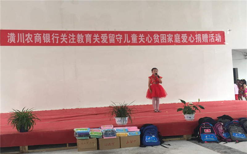 首先,由赵行长代表潢川农商银行党委向在场的小朋友送去“六一”节日的祝福,并作致辞。他告诉孩子们社会上有这么多的爱心人士在关心着他们,希望他们都能沐浴在爱的阳光下健康成长。接着,农商行一行人给孩子们捐赠了书包、文具盒、电子读书仪等学习用品。然后,中心小学詹校长对爱心人士表示谢意,并鼓励孩子们树立起战胜困难的信心和勇气,增强经受住挫折的毅力和意志,自强不息,做一个生活的强者,使自己成为一个对社会有所贡献的人才,不辜负老师、家长、学校对他们的期望。最后,文明办的杨主任和黄寺岗镇戴镇长也对孩子们提出了希望,希望得到捐赠的孩子们能把社会对他们的爱心化成学习的动力,希望老师和学生们一起用优异的成绩回报爱心人士,回报社会。学校师生为本次慰问捐赠活动自发组织了文艺演出。整场演出气氛欢快活泼,充满了童真童趣,孩子们用快乐的歌声、优美的舞姿、稚气的表演来庆祝自己的节日,并向向爱心人士表达深深的感激之情。