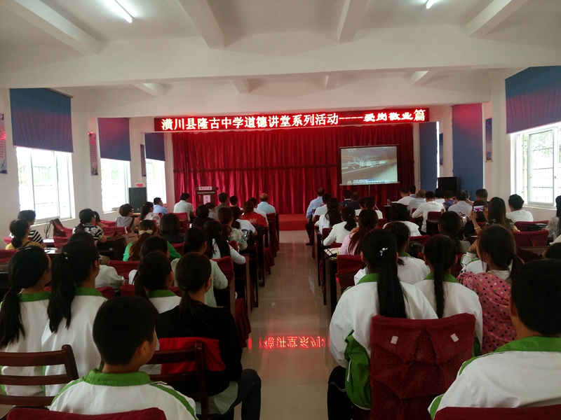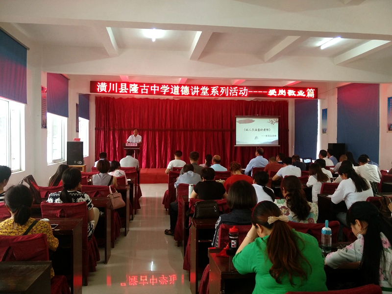 此次活动共设有七个环节: 隆古中学合唱队演唱歌曲《苔》; 全体师生朗诵经典古文《上善若水》; 观看最美女教师张丽莉的相关短片; 老师代表讲述自己与学生的故事; 老师代表谈自己从教几十年来的感悟与经验; 全体教师做承诺; 最后一环节则是该校支部副书记上党课。整个活动过程,教师们精神饱满。该校青年教师代表杨老师讲述精彩而真实的故事吸引着在场所有的师生,故事里的学生正是在场师生们所熟悉的,因为杨老师对待教学的的负责与认真,对待学生的爱心和包容,让这个学生有很大的变化,大家都被杨老师的爱岗敬业和对学生真挚的情感所打动,正如她所说:爱是世界上的灵丹妙药,要做幸福的老师,把爱传出去、把爱带回家。演讲结束后,掌声络绎不绝。