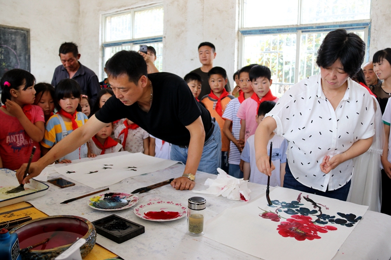 县文联主席李学海、秘书长孔维明,信阳市戏剧曲艺家协会副主席、潢川县戏剧曲艺家协会主席、河南省戏剧曲艺家协会会员王凯祥,信阳市美术家协会副主席、潢川县美术家协会主席陈志立,美术家协会副主席兼秘书长胡国顺以及省美协会员余德忠、孟黎、胡强、吴正琼、杨钧、李涛,县戏剧曲艺家协会骨干成员林云、钱诗林、余霞、饶雯洁、邢学文、邬瑞雪、曹荣英、王忠英、江俊、周爱华、张丽萍、张荣平、袁俊英等艺术家参与活动。来龙中心校副校长陈国栋、工会主席贾伟全程陪同。