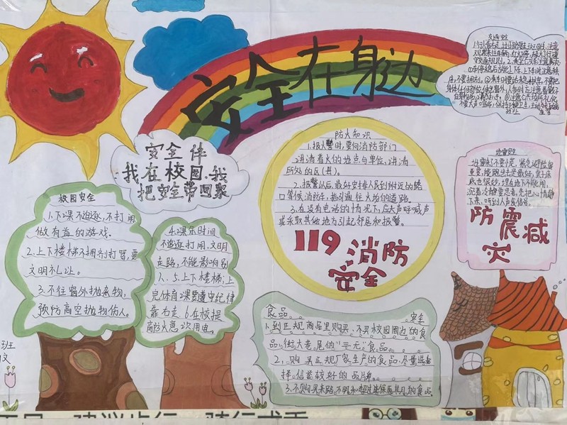 各班级同学积极参与,各类作品主题突出、设计新颖、图文并茂、色彩鲜明。通过查阅资料,同学们将自己了解到的安全知识、自救技能等内容,设计成一幅幅精美的手抄报。