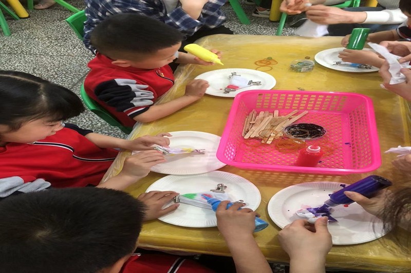 活动前,老师向小朋友们详细地介绍了扎染所需要的材料、工具、操作步骤、扎染方法以及注意事项等等,还带着小朋友一起欣赏了各种扎染的艺术品。