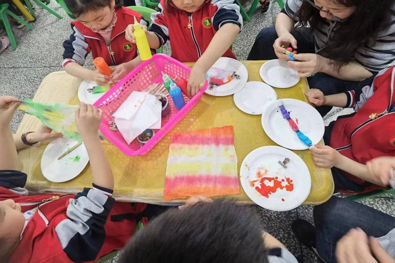 活动中,小朋友们学习不同的扎法,将扎好的布料放入染料里进行浸泡染色。在耐心等待后,小朋友们小心翼翼地打开自己的扎染作品,白色的布竟变成了一件件风格迥异、花样丰富的作品。大家一起交流欣赏,体验成功的喜悦和快乐。