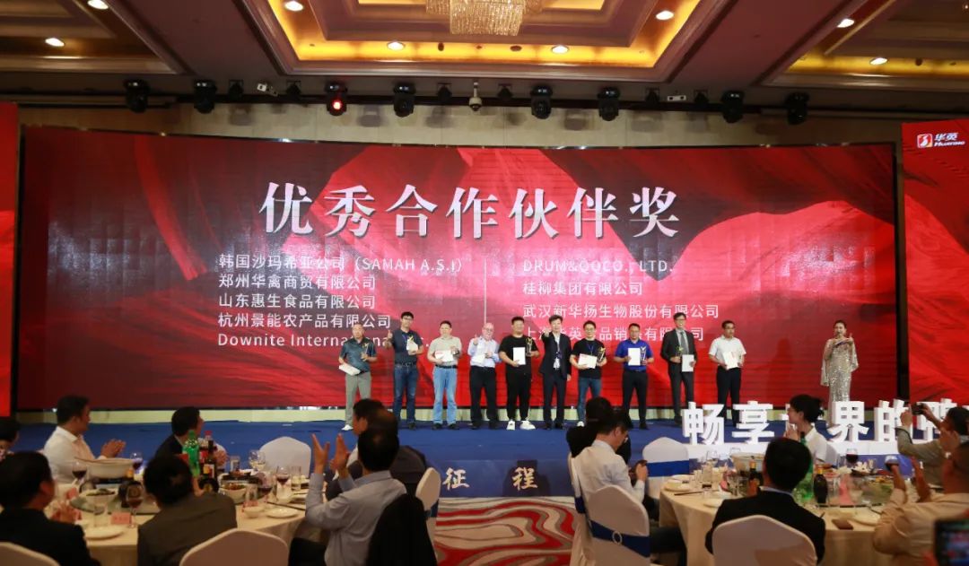 为了答谢社会各界的关心支持,华英农业以“同心同向.共享共赢”为主题举办感恩答谢晚宴。视频互动秀拉开了晚宴的序幕;紧接着对评选出2022年度卓越合作伙伴、优秀合作伙伴、忠诚合作伙伴进行了颁奖;预制菜正值风口浪尖,华英预制菜和熟食新品也在会上进行了发布和展示,引得在场嘉宾的普遍关注。新品推介完毕,许水均董事长与高管团队登台致祝酒词,感谢社会各界对华英农业一如既往的支持和帮助,希望大家继续牵手,共同发展;来到美丽宜居的山水信阳,请大家品美食、饮美酒、结识四海朋友。因为新冠疫情等原因,部分国外的客户无法来现场参会,他们专门录制了视频,分享了和华英的情谊,送来对会议和对参会群体的美好祝愿。现场气氛热烈,大家吃着可口的美食、观赏着精彩的节目,流露出幸福的喜悦。