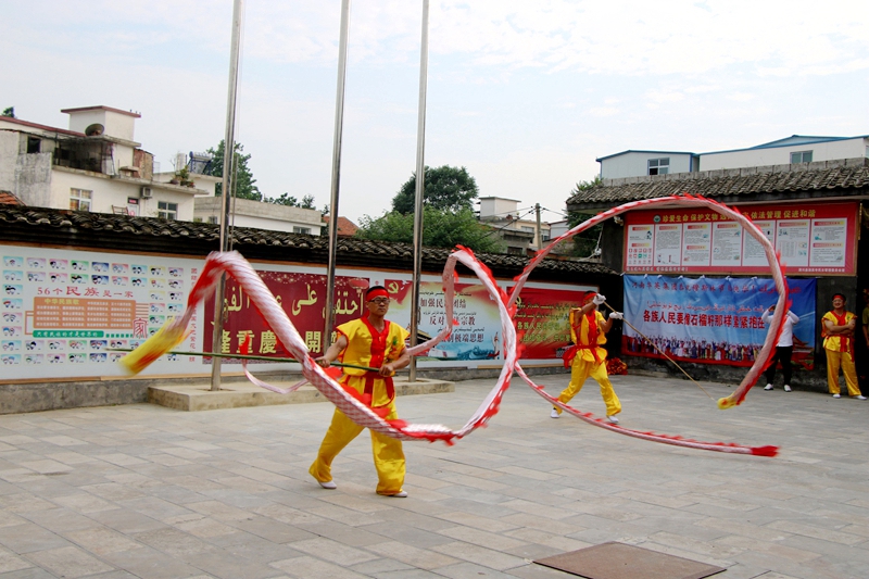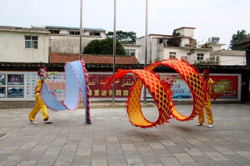 此次的开斋节活动,主要是以中国传统的舞龙项目为主。第一项特意安排了个人舞龙项目——单人龙。只见随着一声鼓响,一条矫健的青龙跃到场中,紧跟着节奏鲜明、鼓点铿锵的节奏,表演者时而翻转,时而跳跃,辗转腾挪,把一条龙舞得活灵活现,栩栩如生。第二个项目是空竹龙表演。也称空竹“呼啦圈”,在我国民间比较盛行,表演者以人民群众喜闻乐见的形式,精湛的技艺赢得了现场阵阵热烈的掌声。第三个项目是来自华英加工厂的各族员工为我们带来精彩的舞青龙表演。只见表演者们身穿节日盛装,欢乐登场,伴随着音乐节奏的逐渐加快,表演者们舞动的速度也越来越快,一条青龙如在云雾中往来穿梭,龙须挥洒飘逸,龙眼炯炯放光,在太阳的映照下,一身龙鳞熠熠生辉......