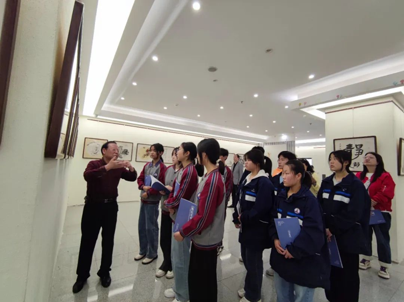 副校长王承忠为学生们讲解国画作品中的“浓、淡、干、湿”,以及中国传统书画中的“诗书画印”意境。提醒同学们要继承和发扬中华民族优秀传统文化,要从书画作品中汲取中华民族的精神营养,培育爱国主义情怀和文化自信心,要把所学带回去,转化为学习动力,不要止步于简单的观展体验,要进一步思考和提高自己。