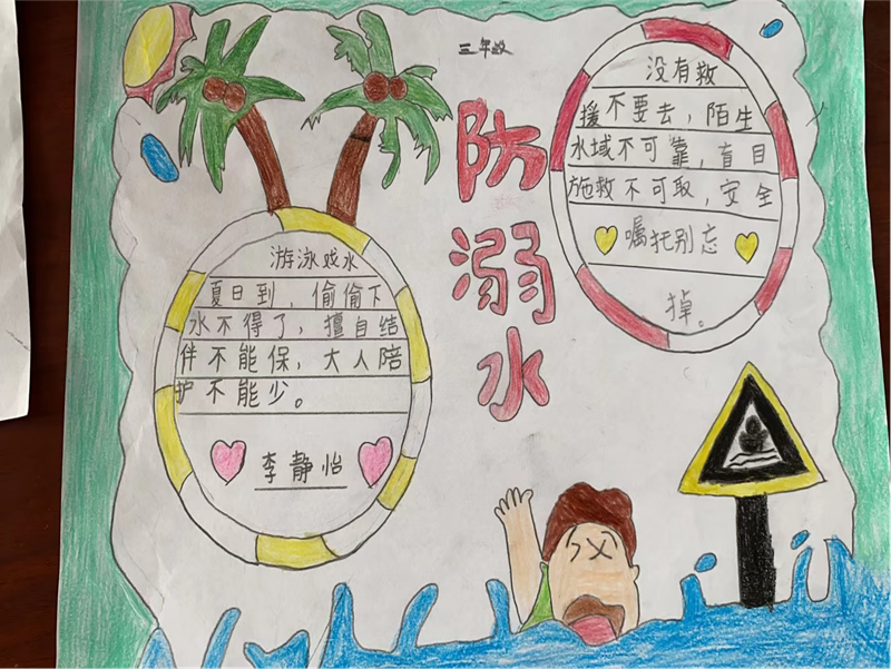 同学们用画笔描绘着心中的安全蓝图,一份份手抄报编排精美,图文并茂,或生动有趣的科普,或言辞诚恳的警示,灵活形象地介绍了防溺水的知识和有效自救自护的一些基本常识。