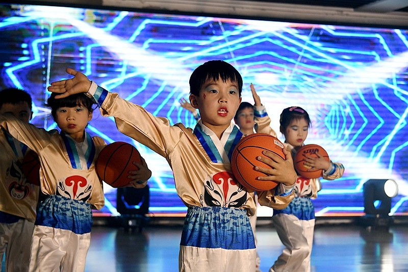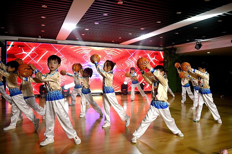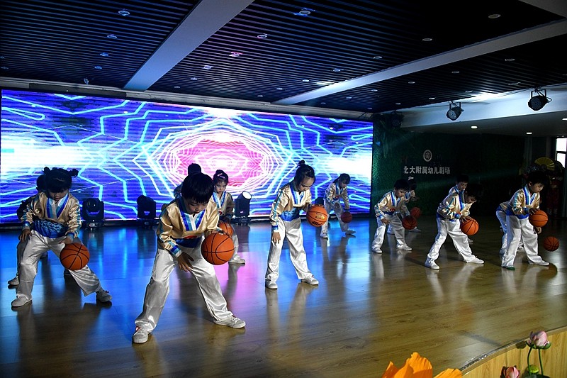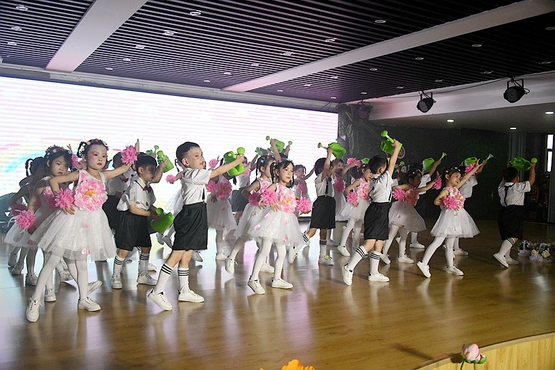 整个会场设计采用清新典雅的小原流花艺风格和山水田园森色系,以彰显幼儿园尚自然展个性的办园目标,整个设计突出上善若水厚德载物的园所文化。活动在阵阵鼓舞声和园长对孩子们的祝福中隆重开场。彰显时代进步,科技发展的《元宇宙》《5G弄潮儿》《狂飙2035》,一个个科普代言让观众眼前一亮;体艺融合课程竹竿舞《东方红》、《戏篮球》,欢快的旋律将体育和艺术相辅相成的动感、美感表现的淋漓尽致。
