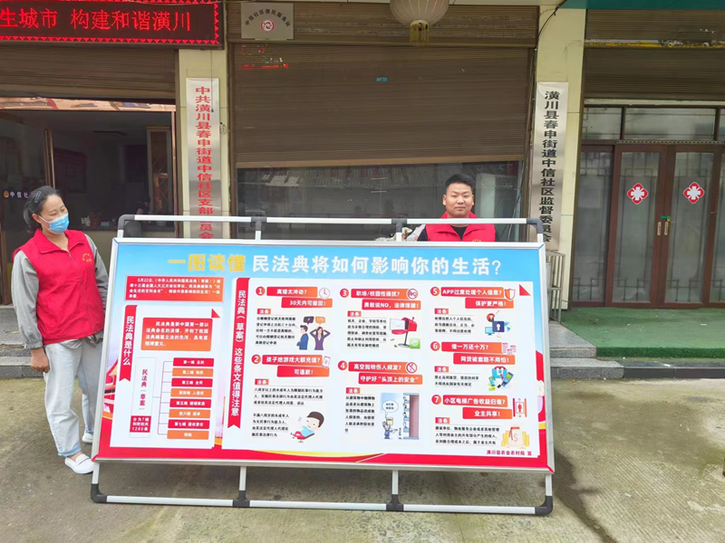 本网讯 为深入学习宣传贯彻党的二十大精神,学习贯彻习近平法治思想和习近平总书记关于加强民法典学习宣传的重要指示精神,让民法典走到群众身边、走进群众心里。5月29日,潢川县农业农村局组织执法人员走进社区开展民法典主题宣传活动,进一步增强了群众守法意识和依法维权能力,为民法典的贯彻实施营造了良好宣传氛围,有力推进法治社会建设。