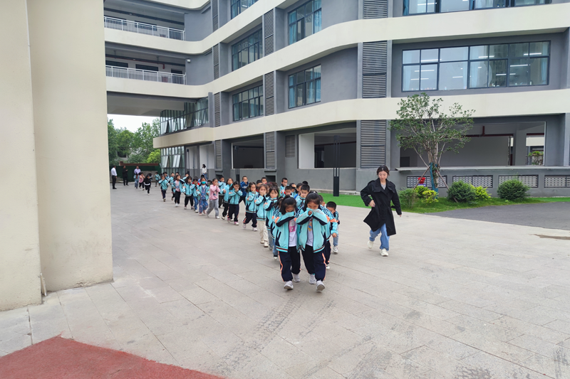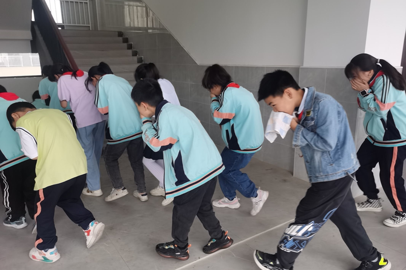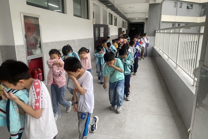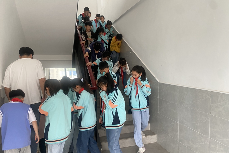 5月29日上午九点四十分随着一阵急促的火灾警报声响起,全体教师立即行动起来到达指定岗位,保证学生安全。孩子们在老师的组织下捂住口鼻,弯腰低身,按照逃生路线快速有序向安全地带撤离。