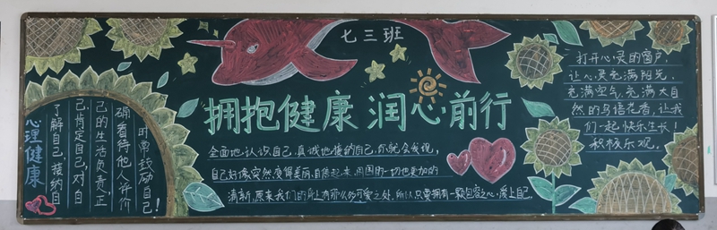 政教处要求各班根据班情,结合学生年龄特点,办一期主题为“拥抱健康,润心前行”的知识板报,传播心理健康理念,引导学生树立积极向上的健康心态,提升学生心理健康素养。