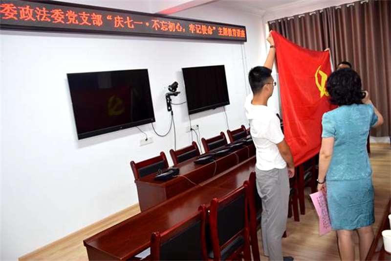 活动中, 由县国安办副主任胡冬梅同志领誓, 县委政法委党支部全体党员面对党旗再次重温入党誓词,表达他们始终牢记党的宗旨和使命,立足岗位做奉献,以实际行动践行入党誓言的决心。