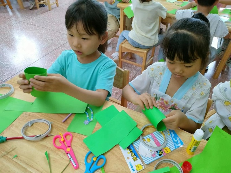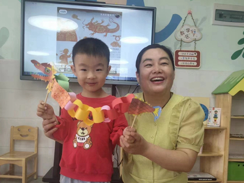 大班幼儿迫不及待的用卡纸制作了各种各样的小粽子,还对五彩绳特别感兴趣。五彩绳又称五彩丝、五色丝等,是端午节的吉祥物兼饰物,具有表达美好祝愿的寓意。孩子们在老师的帮助下拿着彩绳,打结、编花,手绳编织不仅色彩丰富,更是中华民族一份宝贵的文化遗产,与此同时孩子们也体验了民间工艺品的制作乐趣。