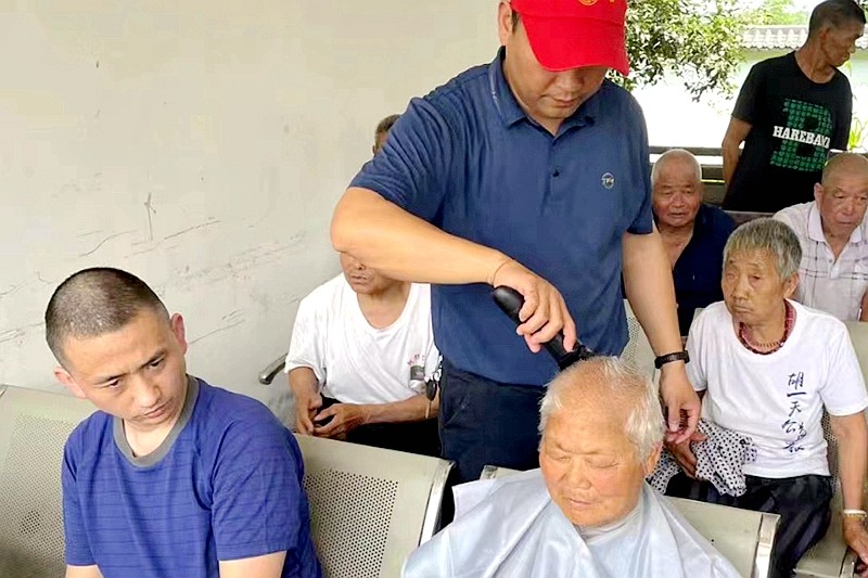副校长朱天峰为老人理发
