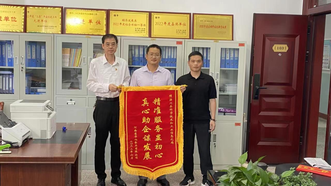 精准服务显初心,真心助企谋发展。6月7日上午,华旭食品公司向县科工局赠送了一面锦旗,对潢川县科工局的高效服务和大力支持表示感谢。县科工局党组成员、局长郝少辉接收了锦旗并与华旭食品相关负责人进行了座谈交流,鼓励华旭公司接续奋斗、健康发展,积极利用好政府的惠企政策,为华英农业做大做强贡献力量!