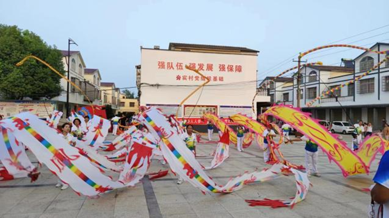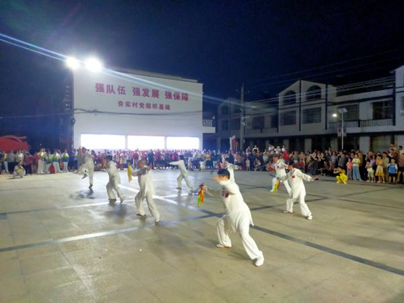 《中国龙舞起来》拉开了序幕、健身秧歌《淮海戏韵》、集体操舞《美丽中国》、拉丁恰恰集体舞“芒果香”、太极拳(械)等10余个精彩节目轮番上演,不时赢得现场群众的阵阵掌声,尤其一条青龙在夜空中上下盘旋,让在场的观众惊叹不已。余店村民即兴与大家互动展示了2曲广场舞表演,其乐融融。