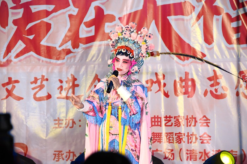 当晚,天福顺广场聚满了前来观看演出的市民群众,整场演出持续一个半小时,潢川县音乐舞蹈家协会、戏剧曲艺家协会的文艺志愿者们用滚烫的激情和朴素的大爱,为观众带来一系列舞蹈、歌曲、戏曲等异彩纷呈的精采演出,志愿者们动听的歌声、优美的舞姿引得现场群众掌声不断。开场舞《在希望的田野上》拉开了演出的序幕,欢快的舞姿、蓬勃的生命力瞬间点燃现场气氛。男高音独唱《 跟你走》用慷慨激昂的歌声,唱出了人民热爱党、跟党走的坚定信念。女声独唱《一路阳光》唱出了逐梦路上我们向光的方向勇毅前行,甜美深情的歌声令我们陶醉。歌曲《醉赤壁》以历史事件古赤壁为背景,用歌声追忆一段远古的美好恋情。黄梅戏巜女附馬》、豫剧巜穆杨会》、越调《焦裕禄》、豫剧《花木兰》、京剧《珠帘寨》、豫剧现代戏《小二黑结婚》选段,流派纷呈,好戏连台,为观众带领中华优秀戏曲文化的熏陶。古典舞蹈《红玉丹心》英姿飒爽,如惊鸿一瞥,惊艳了观众。晚会在舞蹈《再唱洪湖水》的优美的乐曲、翩翩的舞姿中落下帷幕。